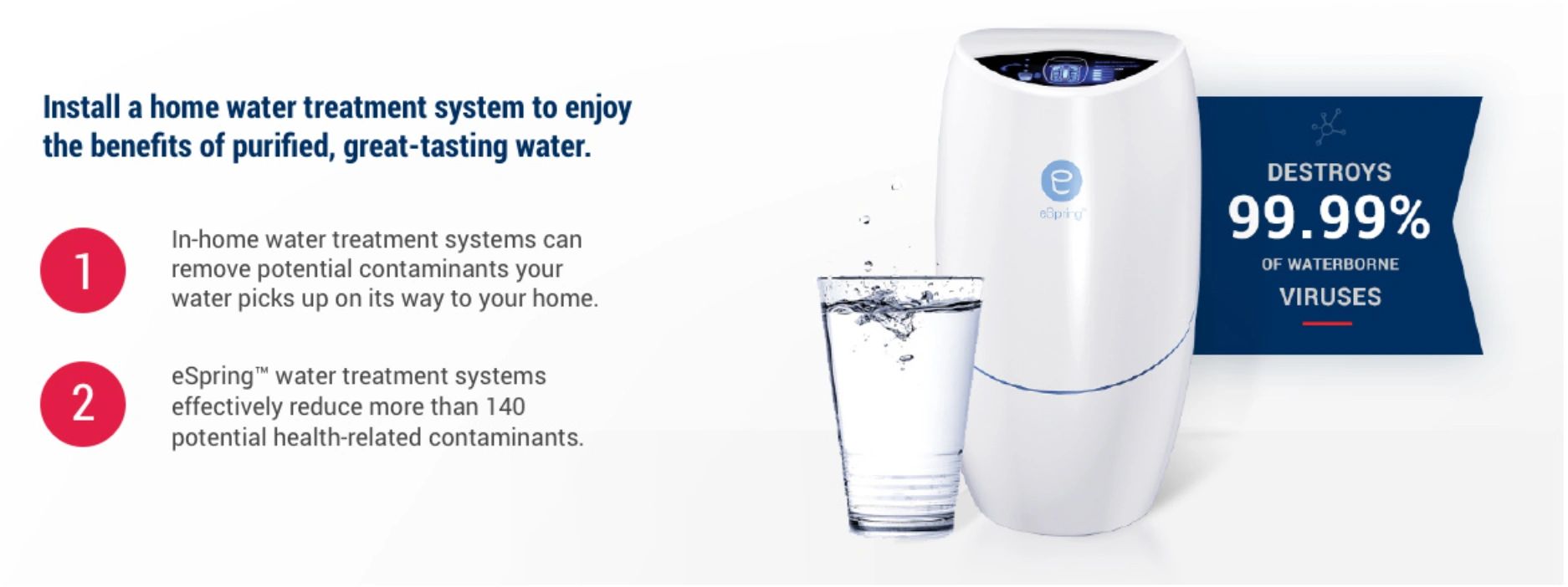 Destroy microorganisms in drinking water with light, not chemicals. The eSpring™ UV Water Purifier also treats water with a UV bulb, which effectively destroy more than 99.99% of waterborne pathogenic bacteria and viruses.